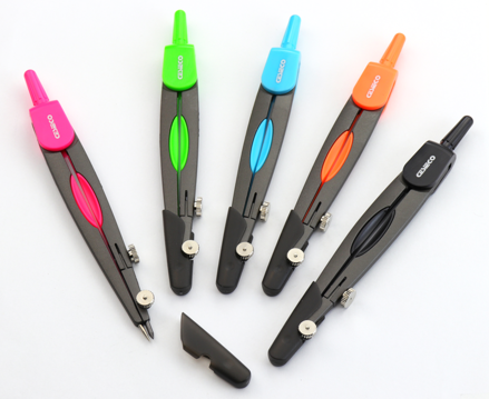 Kvalitní kovové kružítko 140 mm, barevný úchop. V krabičce s tuhami. Titanové tělo / mix barev. Vyrobeno v Německu.
